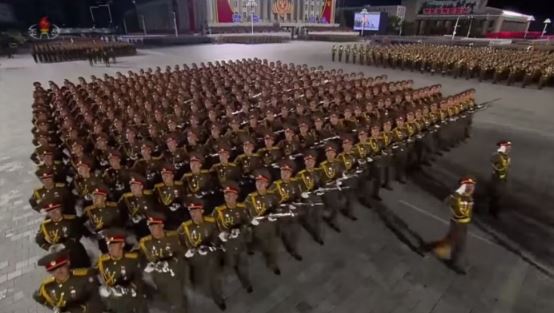 평양에 어둠이 깃든 시각에 열병식을 시작한 것 자체가 세인의 상상을 뛰어넘은 경이로운 사변이었다. 동서고금을 통틀어 야간열병식을 진행한 나라는 조선밖에 없다. 세계에서 처음으로 기상천외한 야간열병식을 진행한 것은 김정은 국무위원장의 결정에 따른 것이었음이 분명하다. 열병식은 대낮에 진행해야 한다는 고정관념과 관례와 격식을 깨고 심야에 열병식을 진행하는 파격적이고 창의적인 발상은 김정은 국무위원장 이외에 누구도 하지 못한다. 사진 1