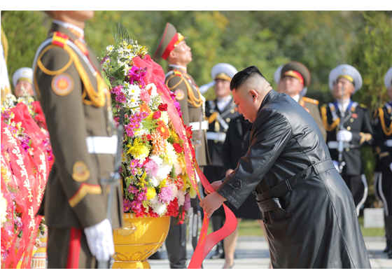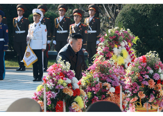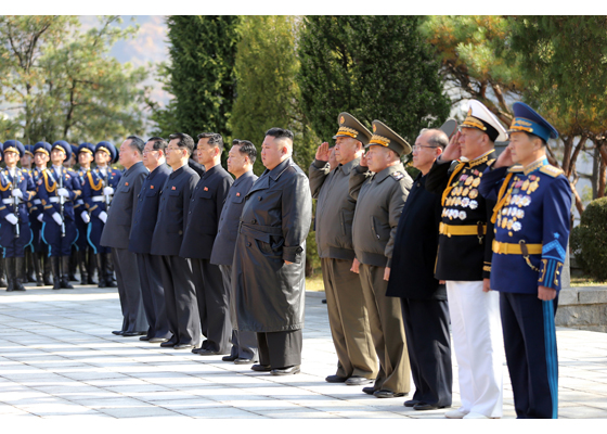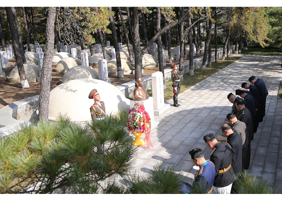 경애하는 최고령도자동지께서는 동행한 당과 국가, 무력의 간부들과 함께 중국인민지원군 렬사들의 묘를 돌아보시였다.