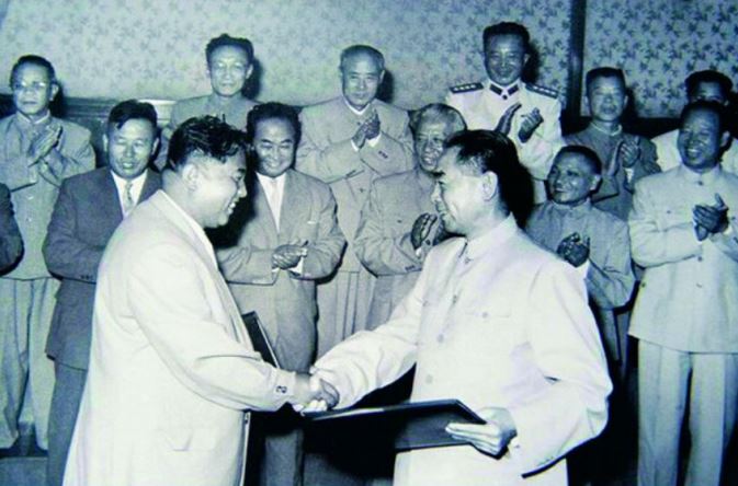 ![]() ![]() ▲ 사진 3 1961년 7월 11일 중국 베이징에서 김일성 주석과 저우언라이 중국 총리는 '조중우호협조 및 호상원조에 관한 조약'을 체결했다. 위의 사진은 김일성 주석과 저우언라이 총리가 조약문에 서명하고 악수를 나누는 장면이다. 그 조약 제2조에 따르면, 중국이 대만통일전쟁에 돌입하면, 조선은 "모든 힘을 다하여, 지체 없이" 중국을 지원해야 한다. 전쟁상황에서 조선이 모든 힘을 다하여, 지체 없이 중국을 지원한다는 말은 중국의 대만통일전쟁이 일어날 때 조선도 지체 없이 조국통일대전에 돌입한다는 뜻이다. |