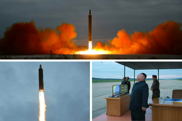 순간 밝아오는 평양의 새벽하늘을 붉은 화광으로 물들이며 거세찬 폭음높이 주체적핵강국의 존엄과 위용을 안고 《화성-12》형이 도도히 솟구쳐올랐다.