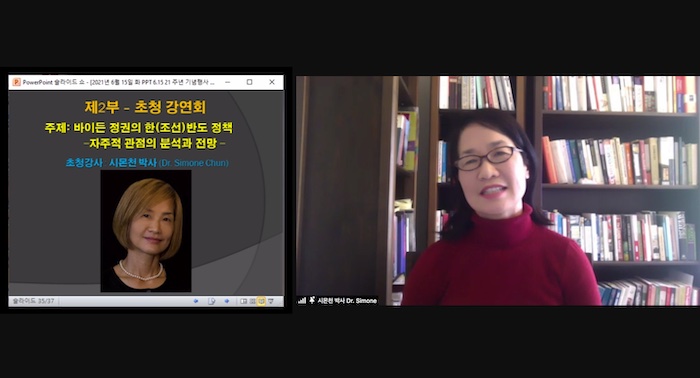 제 2 부 <초청 강연회>는 미국위 사무국장의 사회로 시몬천 박사(Dr. Simone Chun)의 “바이든 정권의 한(조선)반도 정책, 자주적 관점의 분석과 전망“이라는 주제의 강연이 있었다.